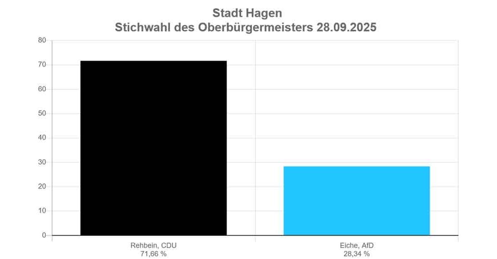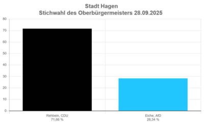 Bei der Stichwahl für das Amt des Oberbürgermeisters hat Dennis Rehbein (CDU) die erforderliche Mehrheit der Stimmen erreicht. Er lag mit 71,66% vor Michael Eiche von...